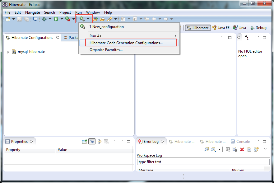 Click vào biểu tượng "Hibernate code generation", sau đó click "Hibernate Code Generation Configuration".