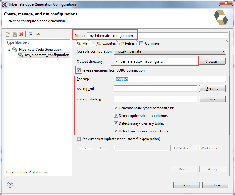 Tại tab "Exporter", chọn những gì bạn muốn Hibernate Tools tạo ra cho bạn chẳng hạn như Entity, mapping file (.hbm.xml) , DAO, annotation code, ...
