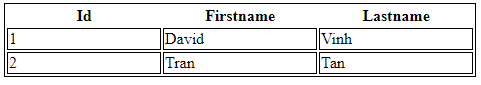 Chọn các cột id, firstname và lastname từ bảng MyGuests và hiển thị nó trong một bảng HTML: