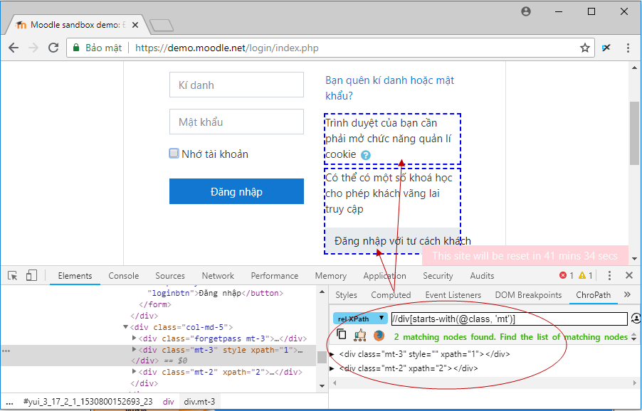 Ví dụ sau tìm thấy 2 phần tử trên trang web https://demo.moodle.net/login/index.php